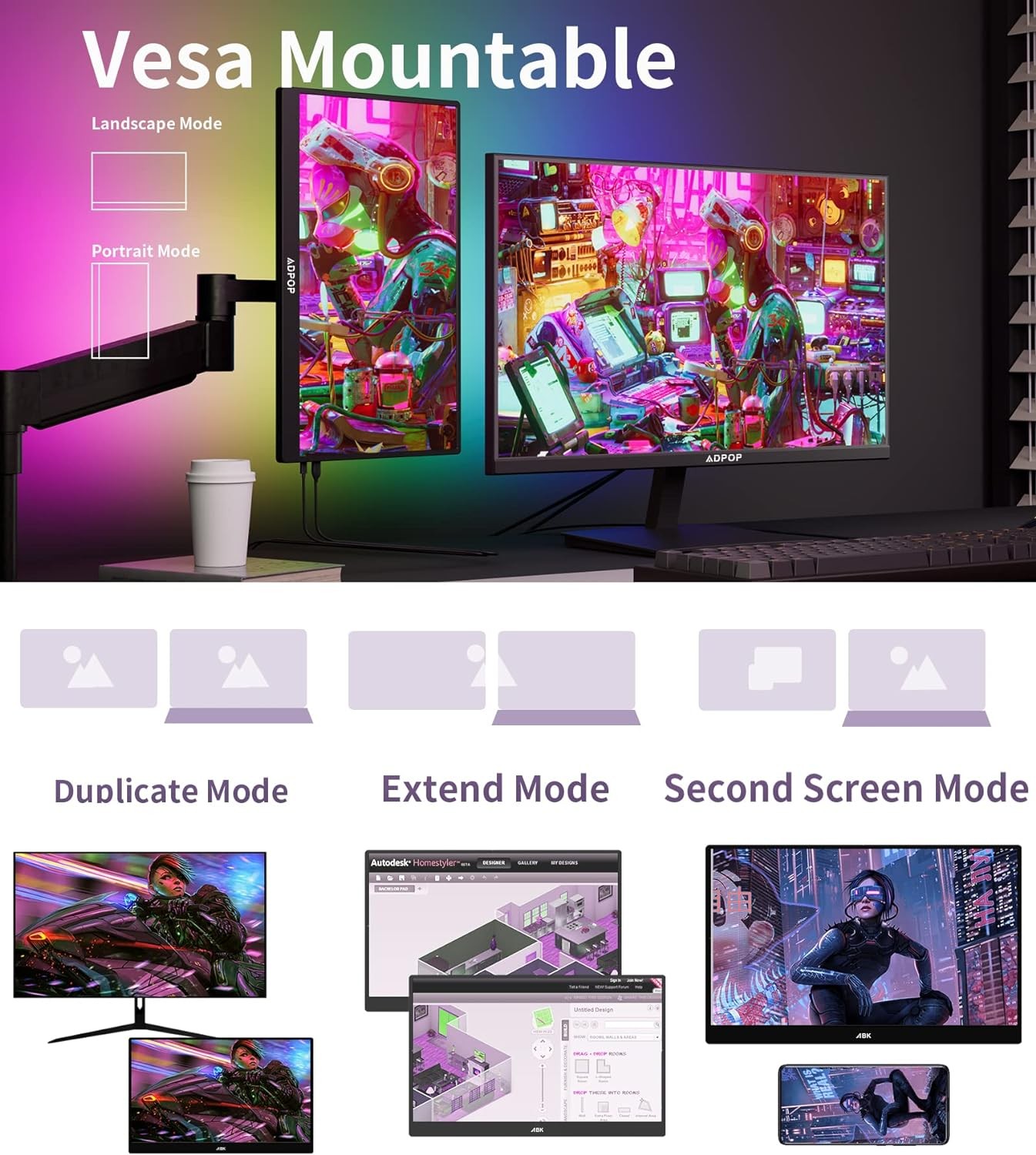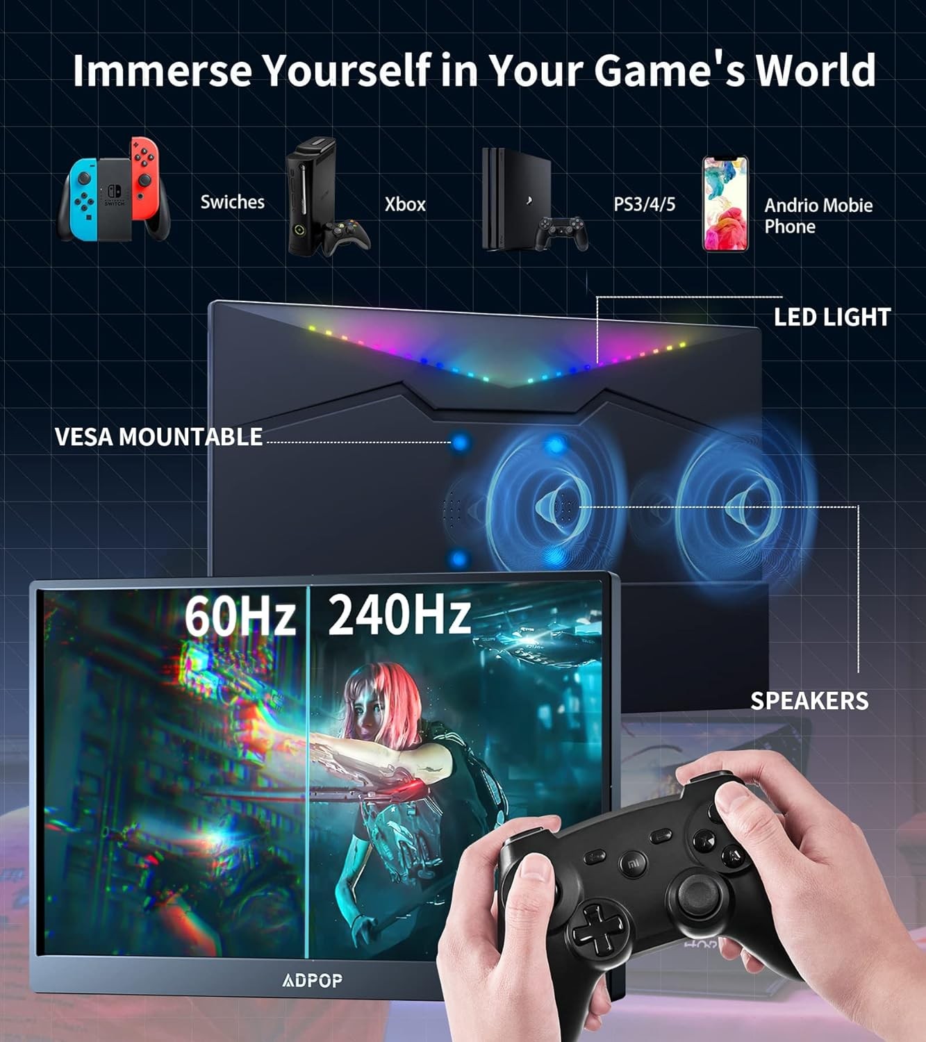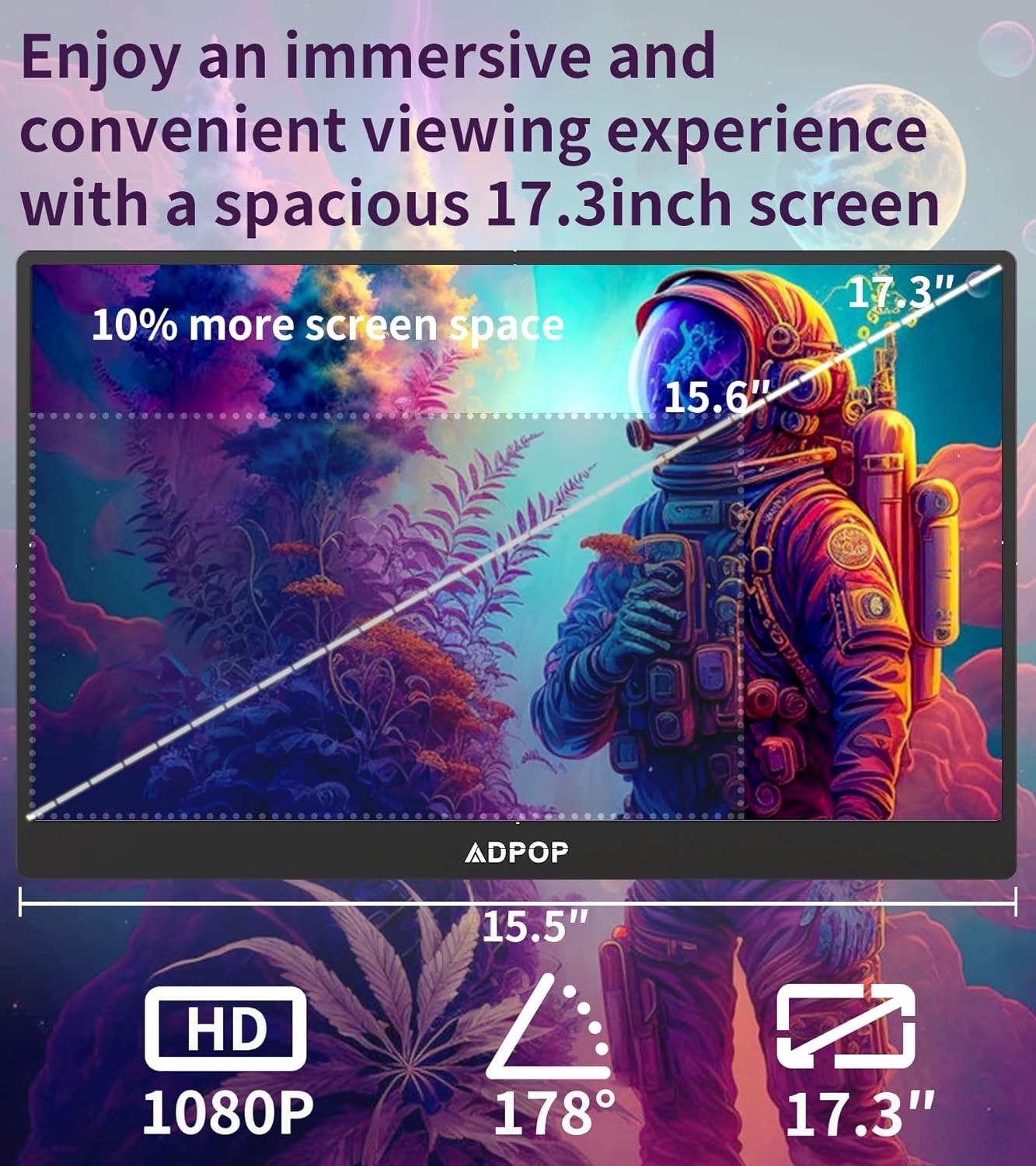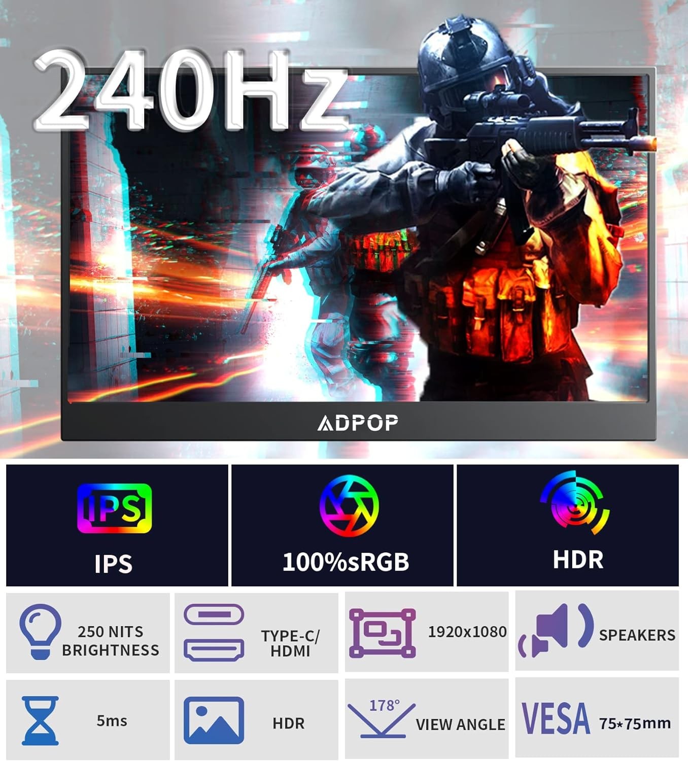 ?【17.3" High Refresh Rate IPS Portable Monitor】ADPOP portable monitor for laptop offers an expansive 178° wide view for immersive productivity and gaming. PC gaming monitor impressive 240Hz refresh rate ensures smooth visuals and comfortable viewing. Plus, the laptop screen extender's specially designed LED backlight on the back features captivating blinking effects, enhancing the visual experience with a personalized view. Wide monitor Ideal for work, gaming, working or entertainment sessions.
