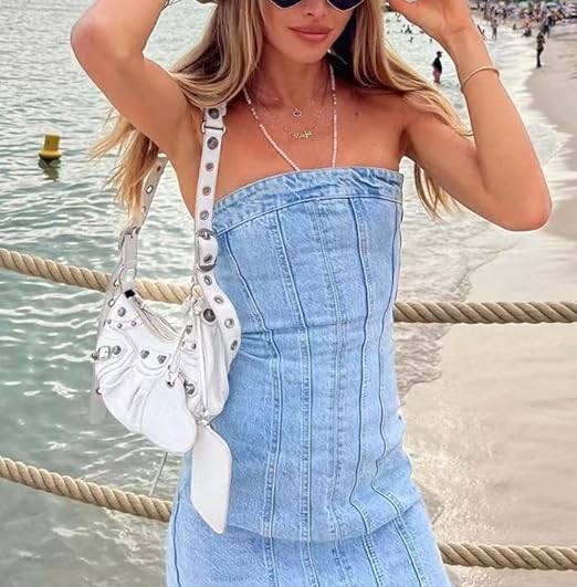 Features: Women's strapless mini denim dress, sexy jean bodycon dress, corset tube denim top dress, button down close or zipper close, slim fit, can be worn as jean corset tube tops and mini body jean dresses.