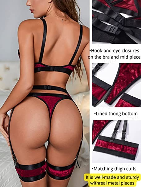 • ✿Feature: This matching bra and panty set with belt and thigh bands is featured with strappy, high leg, metal ring, sheer mesh which shows your curve beautifully.