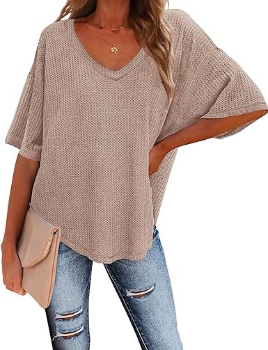 Features: Waffle knited tops with sexy v neck design, it can easily wear as a off the shoulder shirts. Loose batwing half sleeve, Asymmetrical high and low hem, Side split tops, Semi sheer design makes this blouse more perfect suit for dates. Our wardrobes all need such a casual basic solid color shirt.