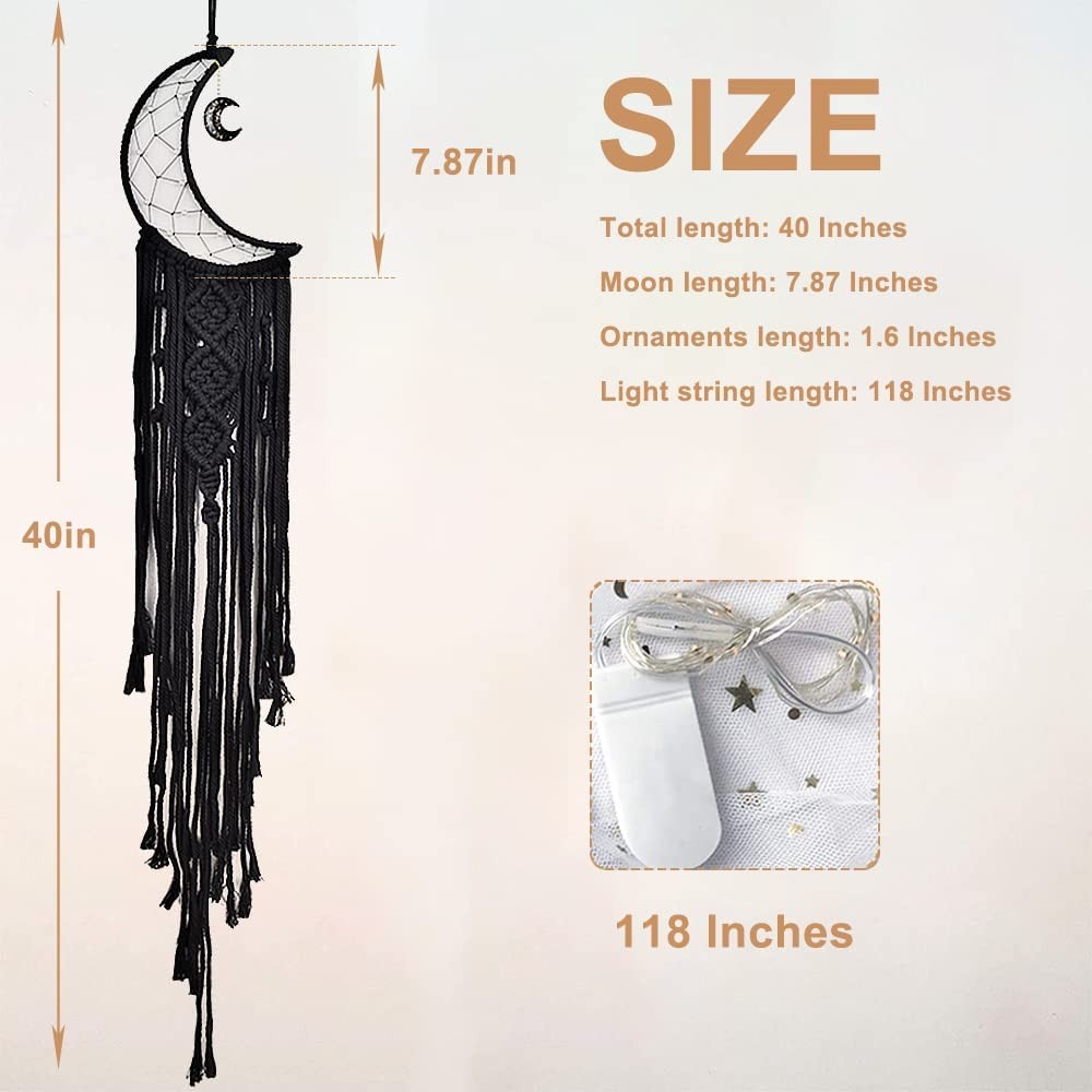 • 【EXQUISITE DESIGN】Our moon dream catcher with lights is designed half-circle moon, hand-woven net in which there are different grids decorated with small white beads. At the head of the half-circle features a metal hollow out half moon pendant, and at the bottom features a lot of cotton ropes arranged irregularity and exquisite weave, add a dreamy and cheerful atmosphere.
