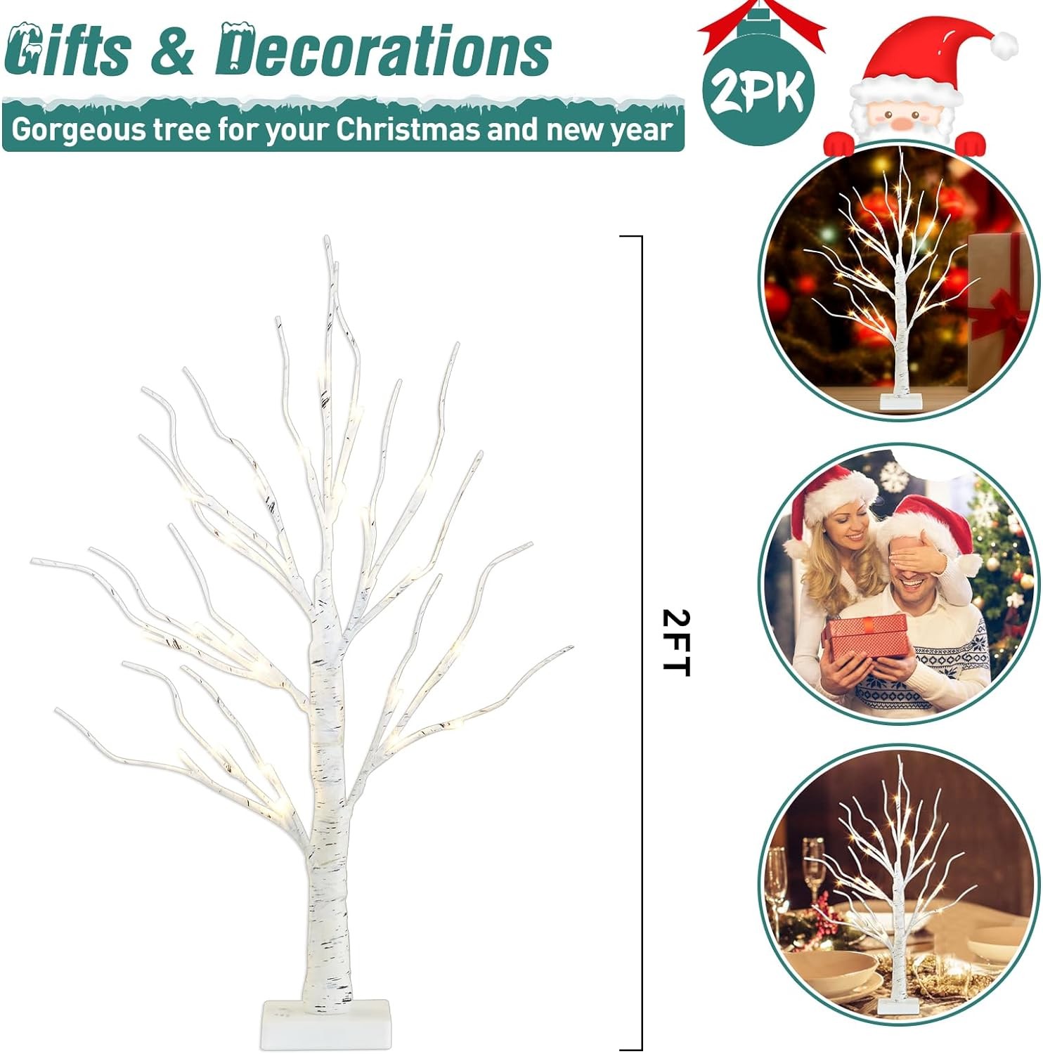 PEIDUO Christmas Decorations, 2FT Birch Tree with LED Lights, Warm White Light up Tree Lamp, Fairy Light Spirit Tree for Xmas Indoor Home Table Fireplace Decor, Battery Powered, 6H/18H Timer (2PK)