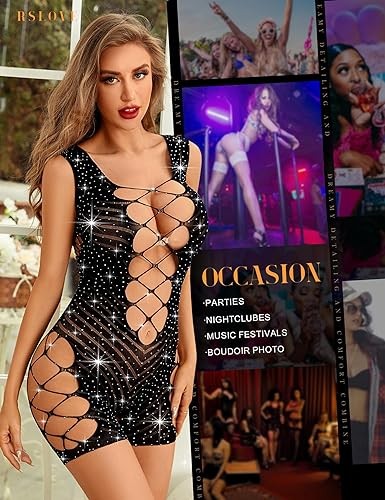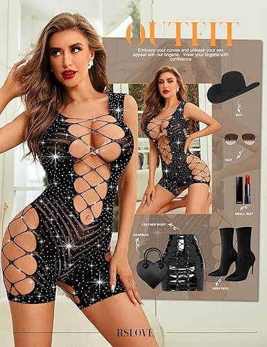 RSLOVE Lingerie for Women Sexy Fishnet Bodysuit Sparkle Rhinestone Teddy Babydoll Cut Out Romper Chemise
