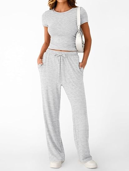 • Features: the slightly cropped, bodycon shirt features side ruching for a flattering, modern look, while the wide-leg pants offer a relaxed, flowy silhouette with a high-waisted elastic band and adjustable drawstring. This dynamic duo combines ease and style, making it perfect for athleisure vibes that transition effortlessly from casual outings to cozy downtime.