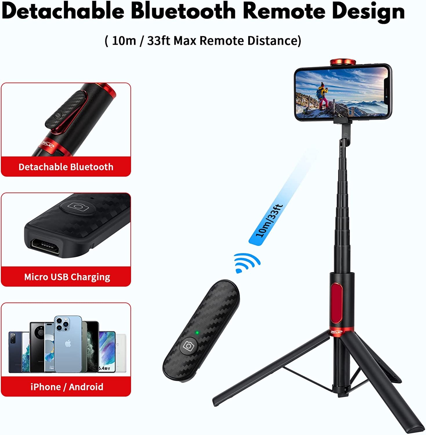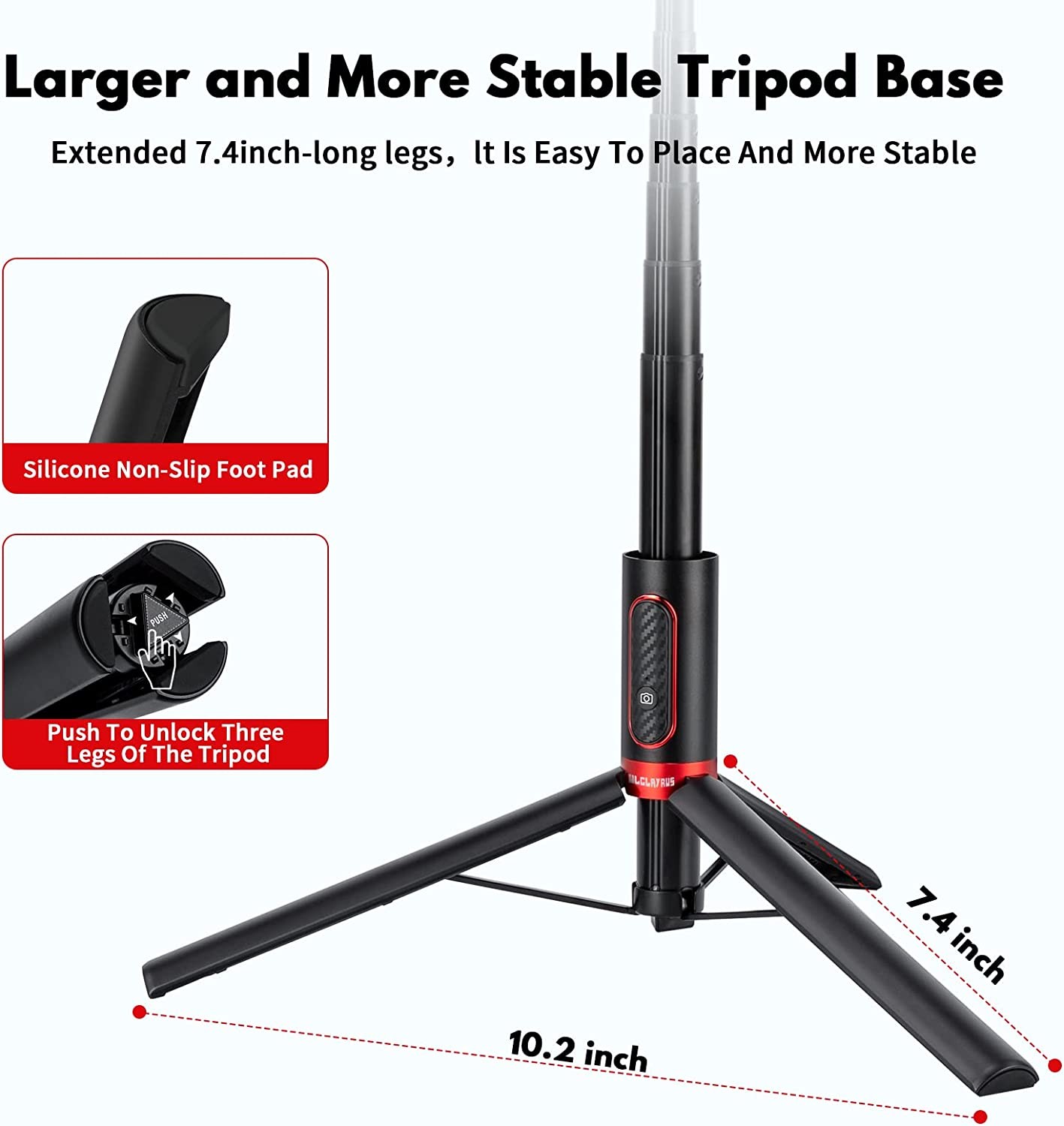 • [Stable & More Large Tripod Base] This compact phone tripod has a 10.2'' tripod base with three non-slip silicone pads on the feet, which could make this selfie stick with remote more stable and firm when it is used as a tripod.
