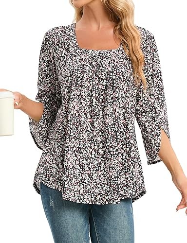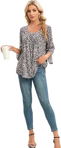 Stylish Features - Womens Business Casual Outfits for Work/3/4 Length Sleeve Dressy Tops/Casual Square Neck Shirts/Pleated Front T-Shirt/Fall Trendy Business Outfits/Ruffle Sleeve Blouses/Womens Tops to Hide Belly/Women's 3/4 Length Blouses