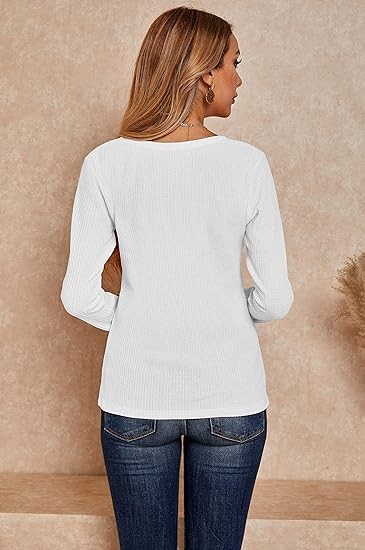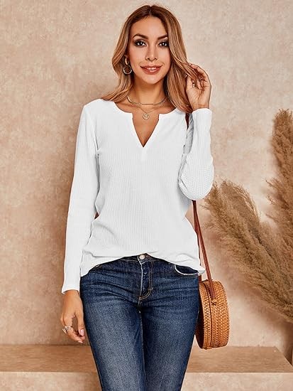 Features: V-neck t shirts for women, long sleeve sweaters, waffle knit tops, plain color, loose fitting pullover top.